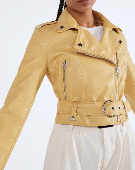 The insulated jacket is made of leather. A light layer of insulation. Details: stand-up collar, zipper, two pockets on the sides.